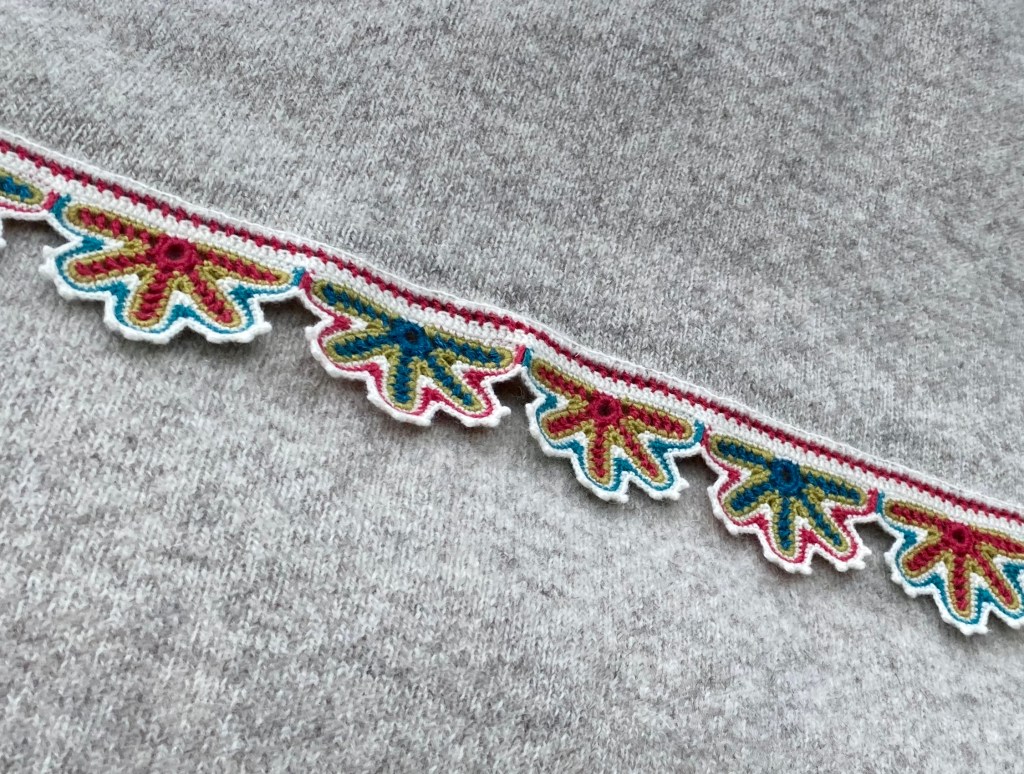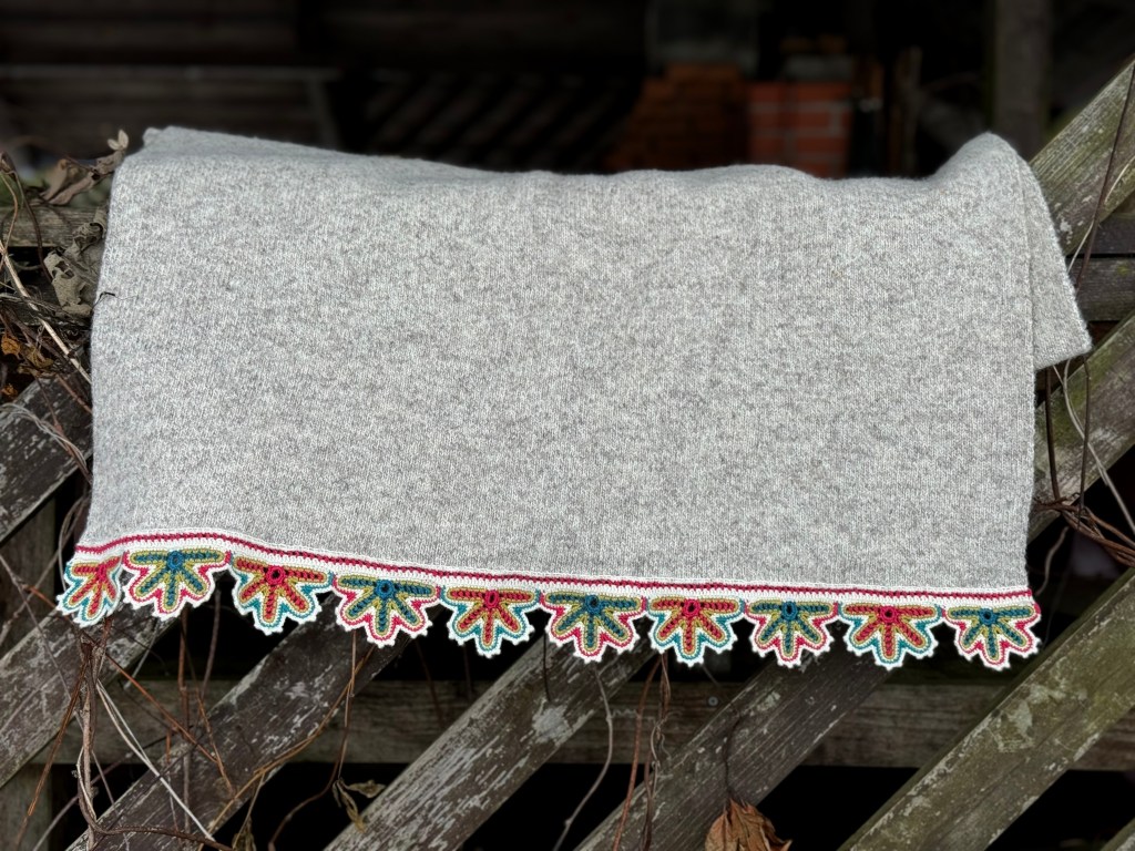 Esimese aasta praktikatööna heegeldasin sõbale äärepitsi, mis on inspireeritud Muhu põllepitsist. Muster on raamatust A. Kabur, A. Pink, M. Meriste “Meite Muhu mustrid”.